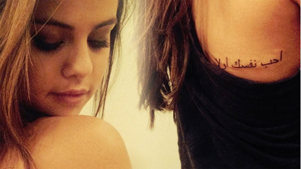 يبدو أن النجمة الأمريكية الشابة سيلينا جوميز، معجبة بالثقافة واللغة العربية، حيث وضعت وشماً مؤخراً على ظهرها بالعربية يتضمن رسالة وجهتها لجمهورها العالمي وهي «أحب نفسك أولاً».